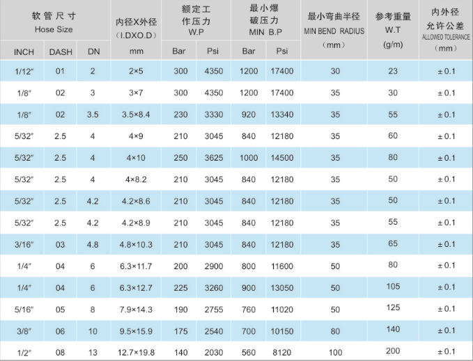 两层纤维编织树脂管部分规格参数: